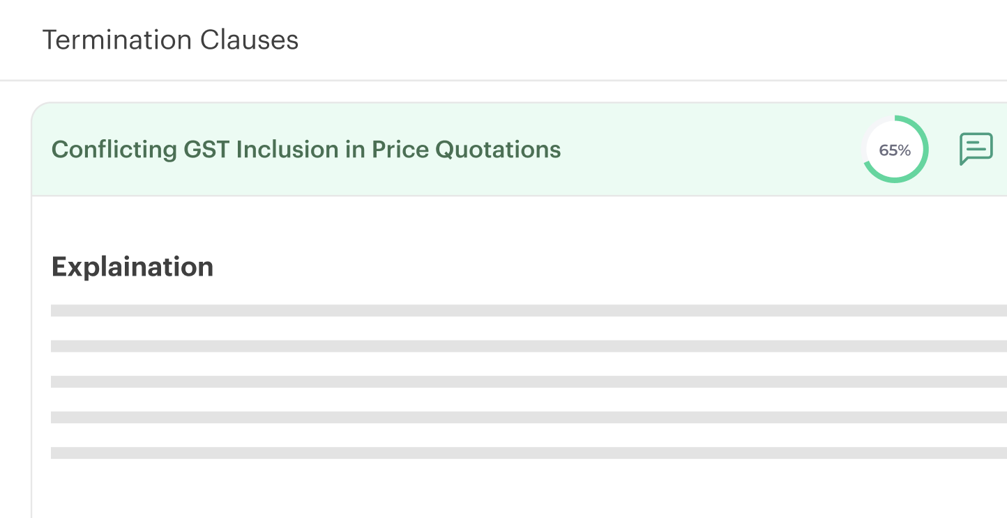 Contradictions are automatically grouped by key tender sections (e.g., Payment Terms, Dispute Resolution, Termination Clauses), allowing your team to prioritize and focus on the highest-risk areas first.