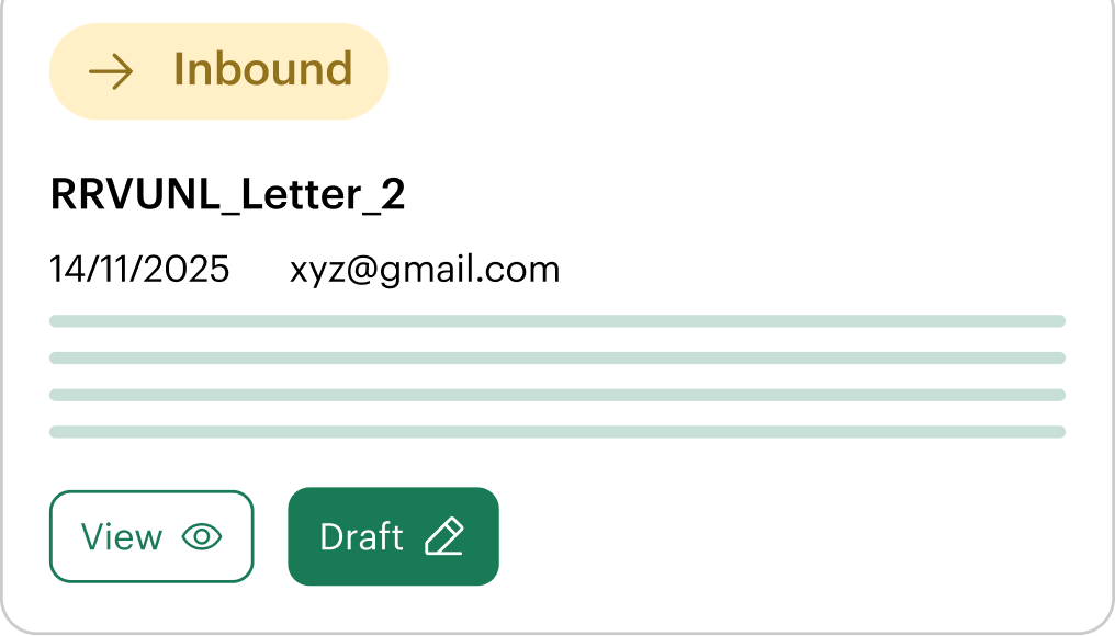 Generate review-ready drafts using the full context of your letter chain - without switching between inboxes/dashboards.