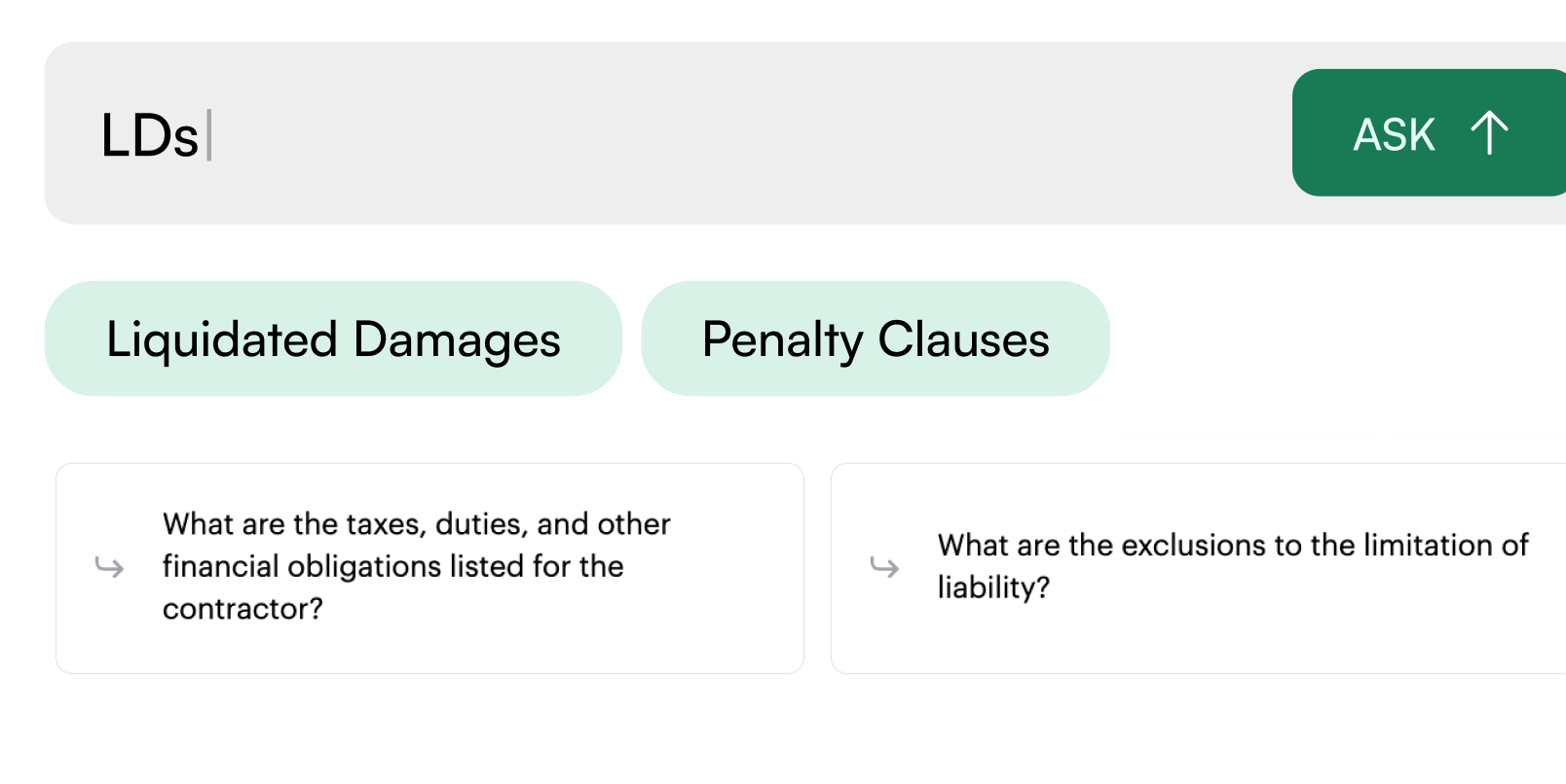 AI understands context, not just word matches — so "LDs," "liquidated damages," and "penalty clauses" all surface the same result.