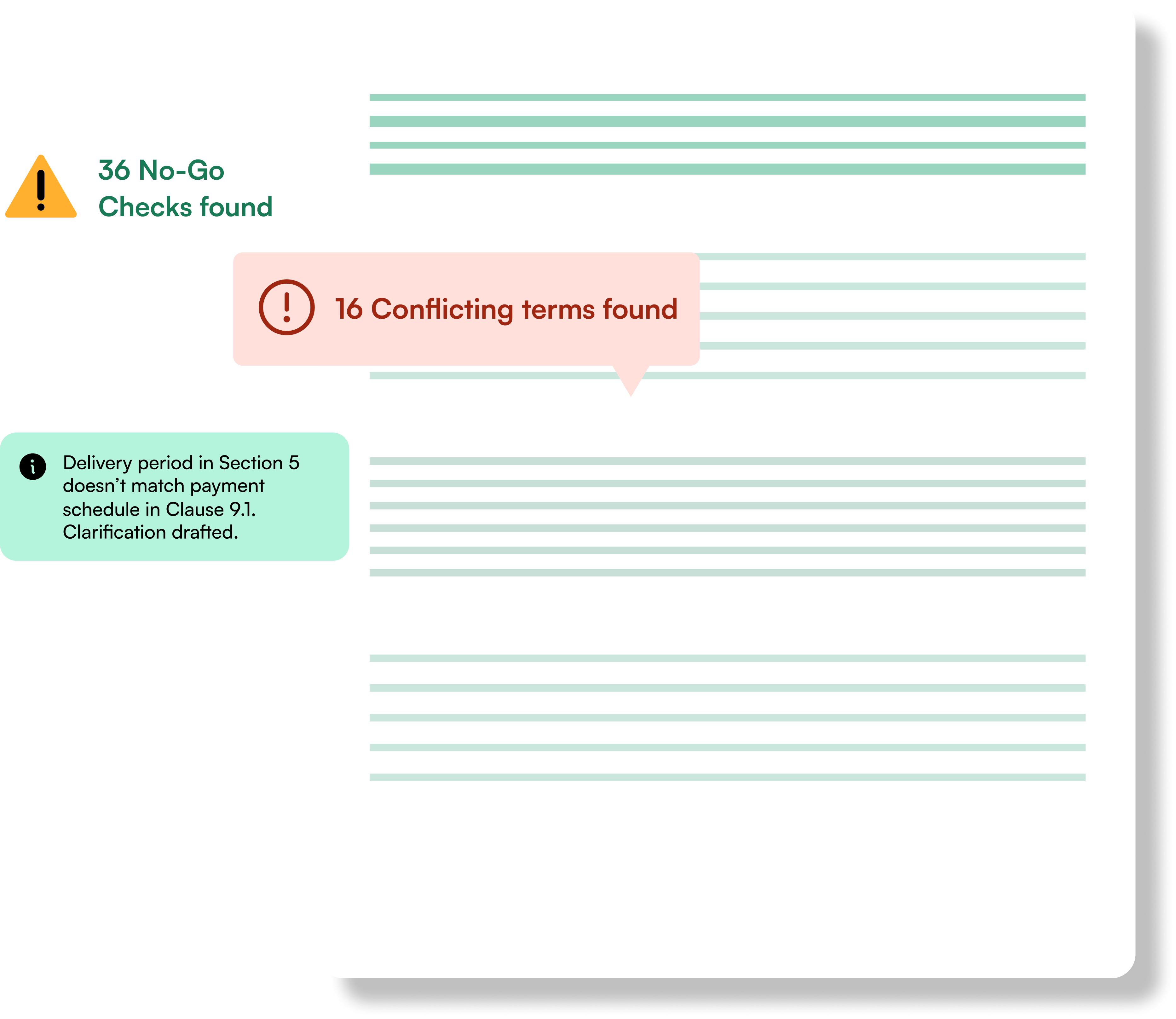 AI highlights potential risks: inconsistent specs, vague timelines, conflicting commercial terms, or missing details. Each is linked to page citations for traceability.