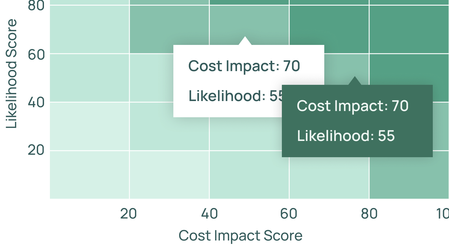 Risks plotted by impact and likelihood, making it easy to prioritize mitigation.